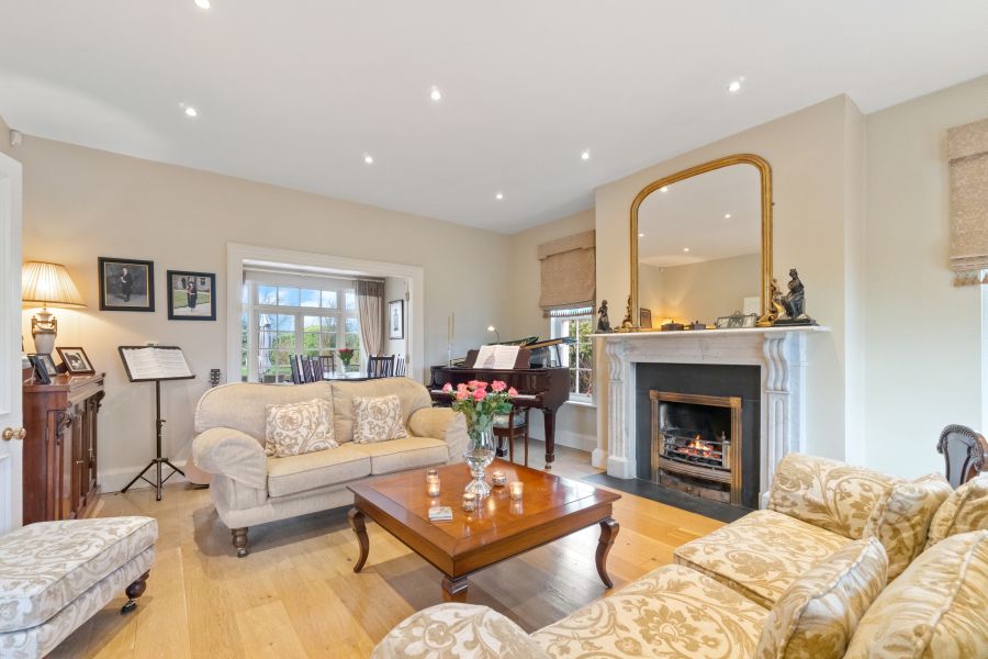 A gravel driveway leads to the wide entrance doorway with its distinctive fanlight and sidelites. Once over the threshold, the large marble floor tiles, exquisitely hand-crafted staircase and high ceilings, showcase the standard of finish throughout this fabulous home. Either side of the entrance hall are two nicely-proportioned sitting rooms, each having dual aspect. Here, the antique marble fireplaces, solid French Oak floorboards (from Burgundy) and elegant drapes create an atmosphere of warmth, luxury and relaxation…a welcoming retreat at the end of a busy day.